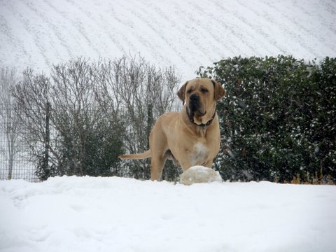ATHOS du Clan des Brésiliens avec le bébé de la famille Le gardien de la propriété sans oublier le ballon Florian prend Athos pour un poney que du bonheur dans la neige du sud ouest près de Toulouse